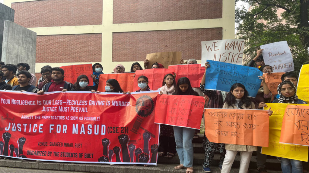উল্লেখ্য, নারায়ণগঞ্জের রূপগঞ্জে পূর্বাচলের ৩০০ ফিট এলাকায় প্রাইভেটকারের ধাক্কায় বুয়েটের কম্পিউটার বিজ্ঞান ও প্রকৌশল (সিএসই) বিভাগের দ্বিতীয় বর্ষের শিক্ষার্থী মোহতাসিম মাসুদ নিহত হন। গুরুতর আহত হন একই ব্যাচের অমিত সাহা এবং মো. মেহেদি হাসান খান। এ ঘটনায় তিনজনকে গ্রেফতার করেছে পুলিশ।