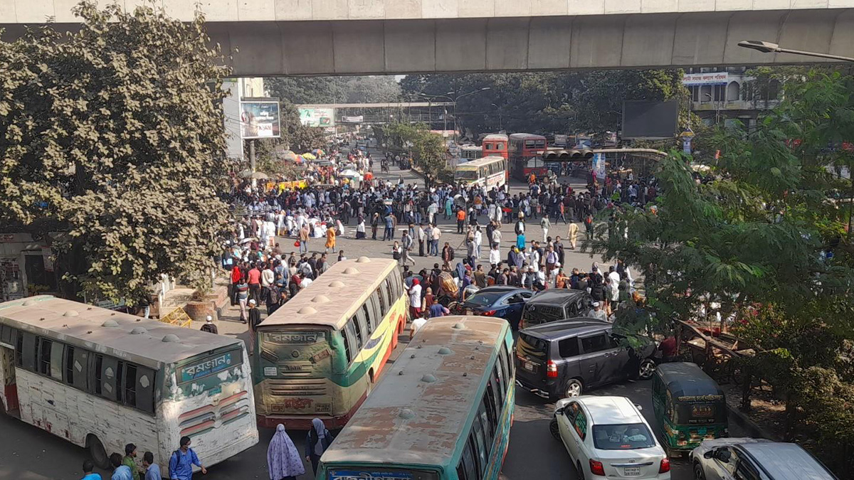 বিএসএমএমইউ’র বেসরকারি ট্রেইনি চিকিৎসকদের শাহবাগ অবরোধ