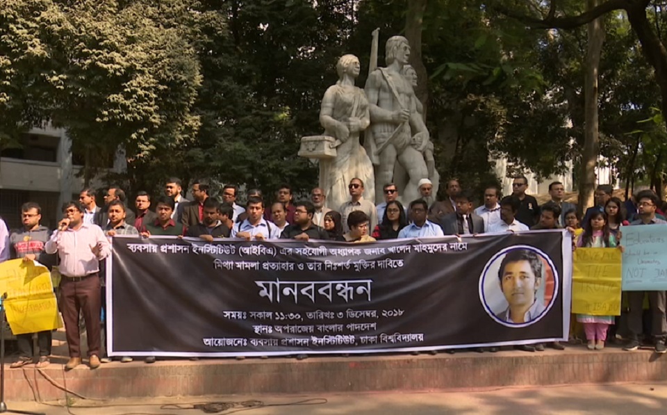 ঢাকা বিশ্ববিদ্যালয়ের আইবিএ ইন্সস্টিটিউটের শিক্ষক সহকারি অধ্যাপক খালেদ মাহমুদের মুক্তির দাবিতে মানববন্ধন করেছেন শিক্ষক ও শিক্ষার্থীরা। সকালে অপরাজেয় বাংলায় ঘণ্টাব্যাপী এই মানববন্ধন হয়।