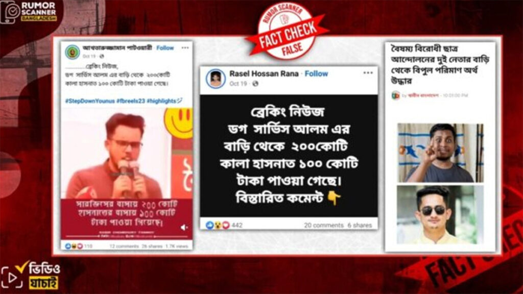 জাতীয় নাগরিক কমিটির মুখ্য সংগঠক ও জুলাই শহিদ স্মৃতি ফাউন্ডেশনের সাধারণ সম্পাদক সারজিস আলম এবং বৈষম্যবিরোধী ছাত্র আন্দোলনের আহ্বায়ক হাসনাত আবদুল্লাহর বাসা থেকে বিপুল টাকা পাওয়া গেছে বলে ইন্টারনেটে যে তথ্য ছড়ানো হয়েছে, তা ভুয়া বলে নিশ্চিত করেছে তথ্য যাচাইকারী প্রতিষ্ঠান (ফ্যাক্ট চেক) রিউমার স্ক্যানার।