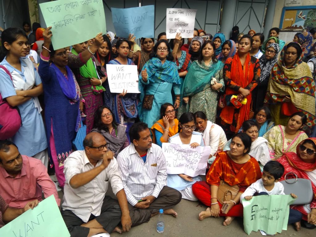 এসময় বিভিন্ন ব্যানারে লেখা দেখা যায়, উই ওয়ান্ট জাস্টিস, এ কেমন শিক্ষা,যারজন্য শিক্ষার্থীকে জীবন দিতে হয়। পদত্যাগের স্লোগান দিয়ে স্কুলের সামনে অবস্থান করছেন অভিভাবকরা।