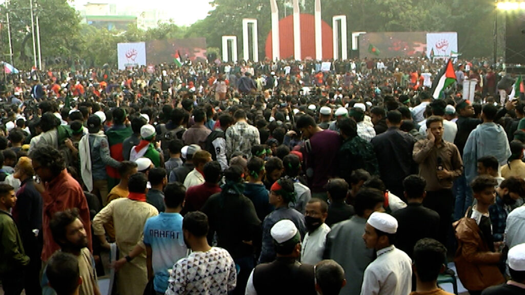 এ সময় ছাত্র-জনতাকে ‘ফাঁসি ফাঁসি ফাঁসি চাই, খুনি হাসিনার ফাঁসি চাই’, ‘আমার ভাই কবরে, খুনি কেন বাহিরে’, ‘দিল্লি না ঢাকা, ঢাকা-ঢাকা’, ‘আবু সাঈদ মুগ্ধ শেষ হয়নি যুদ্ধ’, ‘ভারতীয় আগ্রাসন নিপাত যাক’, ‘গোলামি না আজাদি, আজাদি-আজাদি’, ‘জ্বালো রে জ্বালো, আগুন জ্বালো’, ‘ভারতীয় আগ্রাসন, রুখে দাও জনগণ’, ‘দালালি না রাজপথ, রাজপথ রাজপথ’— প্রভৃতি স্লোগান দিতে শোনা যায়।