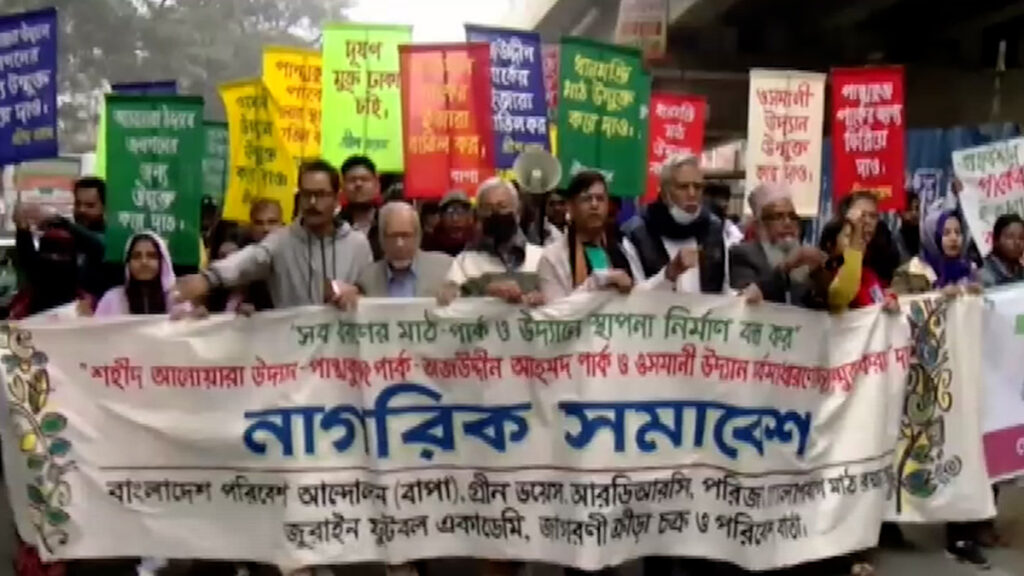 বিভিন্ন স্থাপনা নির্মাণের নামে দখল হওয়া খেলার মাঠ ও পার্ক উন্মুক্ত করে দেয়ার দাবিতে সমাবেশ ও সংক্ষিপ্ত মার্চ করেছে পরিবেশবাদীরা।