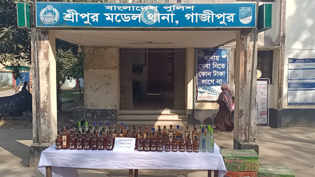 রোববার সকাল দশটায় সংবাদ সম্মেলনের মাধ্যমে এসব তথ্য জানান, শ্রীপুর মডেল থানার প্রাপ্ত কর্মকর্তা ওসি জয়নাল আবেদীন মন্ডল। তিনি বলেন, শনিবার সন্ধ্যা পৌনে সাতটার দিকে গোপন সংবাদের ভিত্তিতে জানা যায়, মাওনা চৌরাস্তা এলাকায় সাবেক সেনা সদস্য নবী হোসেনের বহুতল ভবনে অবৈধ বিদেশি মদ বিক্রির জন্য এনে রাখা হয়েছে। এরপর শ্রীপুর থানা পুলিশ ওই ভবনে অভিযান চালায়। এ সময় ভবনের তৃতীয় তলায় একটি কক্ষে মশার কয়েলের সাতটি কার্টন থেকে বিভিন্ন ব্র্যান্ডের ৮৭ বোতল বিদেশি মদ উদ্ধার করা হয়।