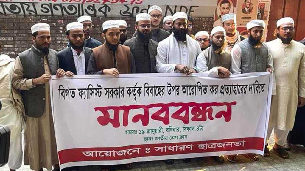 বিয়ের ওপর কর ধার্যের প্রতিবাদে রাজধানীতে মানববন্ধন করেছে ‘সাধারণ ছাত্র-জনতা’র ব্যানারে একটি সংগঠন। আজ রোববার (১৯ জানুয়ারি) বিকেলে রাজধানীর জাতীয় প্রেসক্লাবের সামনে এ মানববন্ধন কর্মসূচি পালিত হয়।