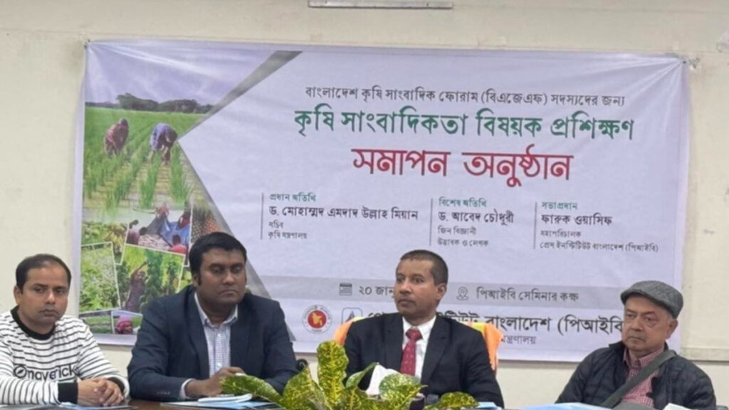 সোমবার (২০শে জানুয়ারি) রাজধানীর প্রেস ইন্সটিটিউট বাংলাদেশ (পিআইবি) আয়োজিত বাংলাদেশ কৃষি সাংবাদিক ফোরামের (বিএজেএফ) সদস্যদের জন্য কৃষি সাংবাদিকতা বিষয়ক প্রশিক্ষণের সমাপনী অনুষ্ঠানে প্রধান অতিথির বক্তব্যে তিনি এসব কথা বলেন।