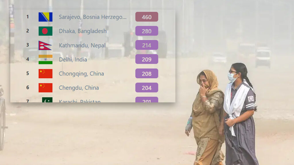 সংস্থাটি জানায়, বায়ু দূষণের তালিকার শীর্ষে অবস্থান করছে বসনিয়া ও হার্জেগোভিনার রাজধানী সারাজেভো, স্কোর ৪৬০। অর্থাৎ এখানকার বাতাসের মান নাগরিকদের জন্য দুর্যোগপূর্ণ। দ্বিতীয় অবস্থানে থাকা বাংলাদেশের রাজধানীর স্কোর ২৮০, অর্থাৎ এখানকার বাতাসের মান খুবই অস্বাস্থ্যকর।