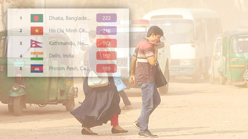 সংস্থাটি জানায়, ২২২ স্কোর নিয়ে বায়ু দূষণের তালিকার শীর্ষে অবস্থান করছে বাংলাদেশের রাজধানী ঢাকা। অর্থাৎ এখানকার বাতাসের মান খুবই অস্বাস্থ্যকর। দ্বিতীয় স্থানে রয়েছে ভিয়েতনামের হো চি মিন সিটি, স্কোর ২১৬। এখানকার বাতাসও নাগরিকদের জন্য খুব অস্বাস্থ্যকর।
