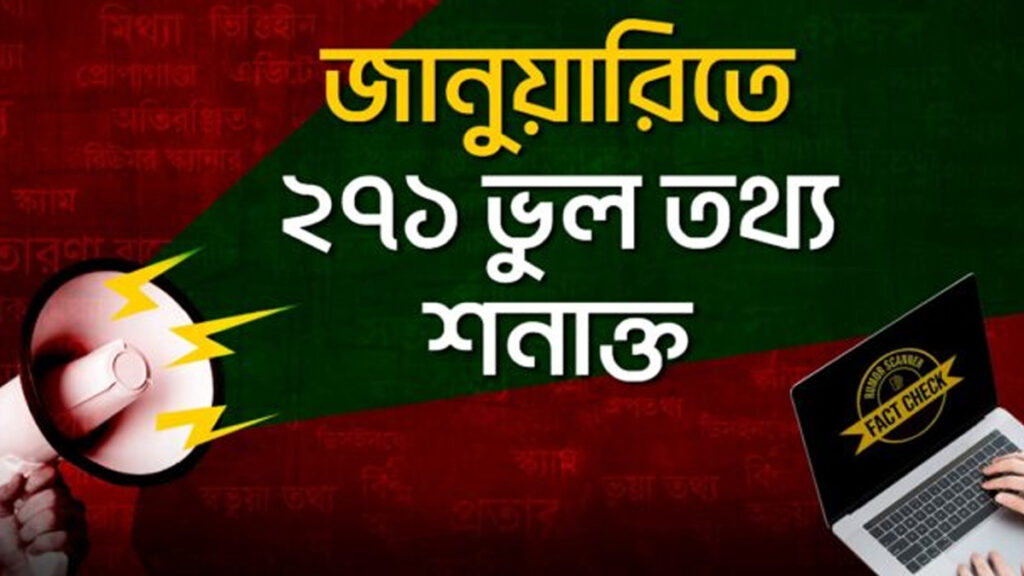 চলতি বছরের জানুয়ারিতে ইন্টারনেটে ছড়িয়ে পড়া ২৭১টি ভুল তথ্য শনাক্ত করা হয়েছে বলে জানিয়েছে ফ্যাক্টচেকিং প্রতিষ্ঠান রিউমার স্ক্যানার। ক্যাটাগরিভিত্তিক ভুল তথ্য শনাক্ত ছাড়াও বিদায়ী মাসে দুইটি পরিসংখ্যান এবং একটি ফ্যাক্ট ফাইলও প্রকাশ করেছে প্রতিষ্ঠানটি। রোববার (২ ফেব্রুয়ারি) এক প্রতিবেদনে এই তথ্য জানায় প্রতিষ্ঠানটি।