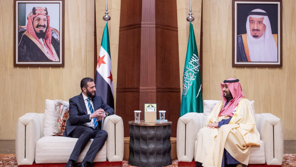 টেলিভিশনে সরাসরি সম্প্রচারি ফুটেজে দেখা যায়, রাজধানী রিয়াদে ক্রাউন প্রিন্সের সাথে করমর্দন করছেন সিরিয়ার নতুন প্রেসিডেন্ট আহমেদ আল-শারা।