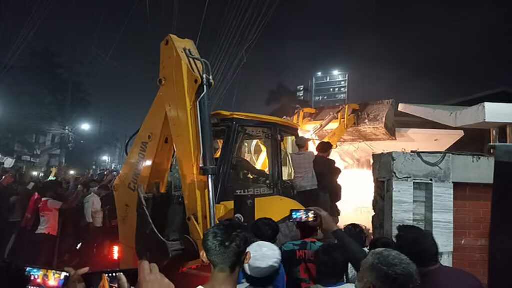 খুলনা নগরীর ময়লাপোতা মোড় সংলগ্ন শেরেবাংলা রোডের শেখবাড়ি খ্যাত ভবনটি বুলডোজার দিয়ে গুঁড়িয়ে দিয়েছে বৈষম্য বিরোধী শিক্ষার্থীরা।