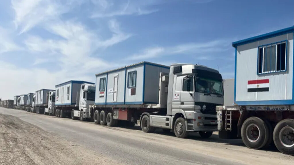 মিশরীয় টেলিভিশন চ্যানেল আল কাহেরা নিউজ জানিয়েছে, ১৫টি মোবাইল হোম এবং একটি বুলডোজার বহনকারী পাঁচটি ট্রাক রাফাহ ক্রসিংয়ের মিশরীয় দিক অতিক্রম করে গাজায় প্রবেশের অনুমতি পাওয়ার আগে কারেম আবু সালেম টার্মিনালে (হিব্রুতে কেরেম শালোম) প্রবেশ করে।
