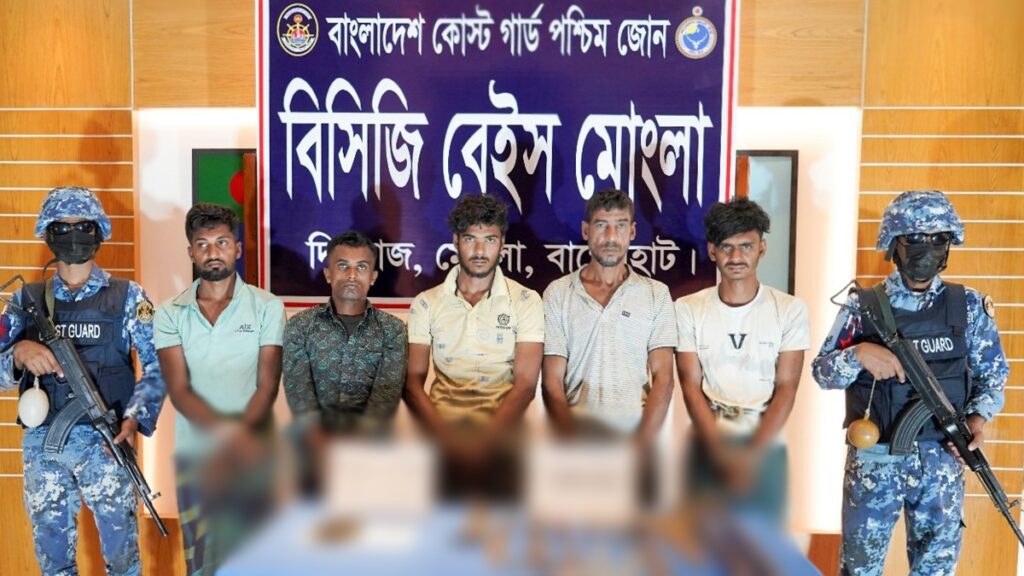 কোস্টগার্ড জানায়, শুক্রবার বাণিজ্যিক জাহাজে চুরির উদ্দেশ্যে কয়েকজন মোংলা হতে হারবারিয়ার দিকে যাওয়ার প্রস্তুতি নিচ্ছে বলে খবর পাওয়া যায়। এই তথ্যের ভিত্তিতে বিকেলে কোস্টগার্ড পশ্চিম জোনের একটি দল মোংলার ভদ্রা ফরেস্ট অফিস সংলগ্ন এলাকায় অভিযান চালায়। এ সময় সন্দেহজনক একটি বোটে তল্লাশি চালিয়ে ৯ পিস ইয়াবা, আনুমানিক ২৫ গ্রাম গাঁজা, ১২টি দেশীয় অস্ত্রসহ ৫ জনকে আটক করা হয়।