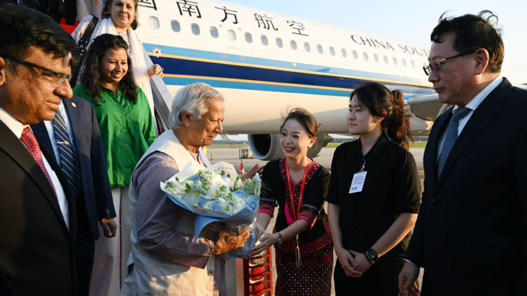 এর আগে, বুধবার দুপুর ১টায় হযরত শাহজালাল আন্তর্জাতিক বিমানবন্দর থেকে চীনের উদ্দেশ্যে রওনা হন প্রধান উপদেষ্টা। এর আগে চীনা রাষ্ট্রদূতের সাথে বৈঠকও করেন তিনি।