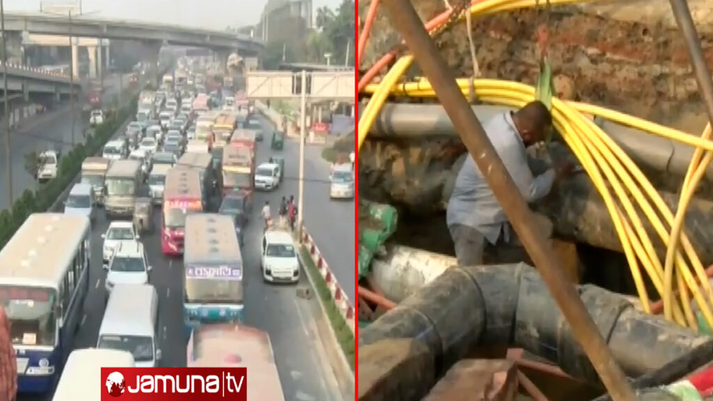 মূলত খিলক্ষেত থানার সামনের সড়কের দুই পাশে এমআরটি লাইন-১ এর ভূগর্ভস্থ তিতাস গ্যাসের বিদ্যমান গ্যাস লাইন স্থানান্তর কাজের জন্যই এই যানজট। কিছুক্ষণ পরপর গাড়ি থামিয়ে মালামাল আনা-নেয়া আর খোঁড়াখুঁড়ির কারণে যানজট দেখা দেয়।