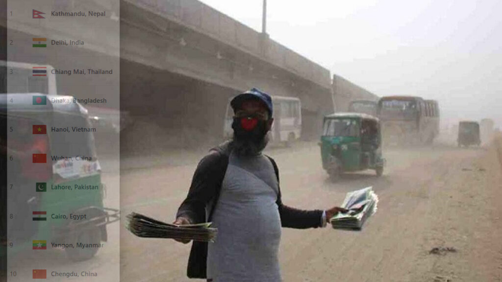 সংস্থাটি জানায়, ২৫৬ স্কোর নিয়ে বায়ু দূষণের তালিকার শীর্ষে অবস্থান করছে নেপালের কাঠমান্ডু। সেখানকার বাতাসের মান ‘খুব অস্বাস্থ্যকর’। দ্বিতীয় স্থানে রয়েছে ভারতের দিল্লি। শহরটির স্কোর ১৯২, অর্থাৎ সেখানকার বাতাস বসবাসকারীদের জন্য ‘অস্বাস্থ্যকর’।