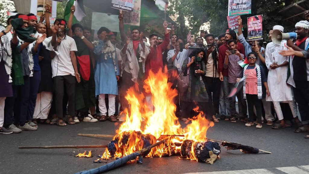 ইসরায়েলের প্রধানমন্ত্রী বেনিয়ামিন নেতানিয়াহু ও মার্কিন প্রেসিডেন্ট ডোনাল্ড ট্রাম্পের কুশপুত্তলিকা দাহ করেছে ঢাকা বিশ্ববিদ্যালয়ের একদল শিক্ষার্থী। মঙ্গলবার (৮ এপ্রিল) বিশ্ববিদ্যালয়ের রাজু ভাষ্কর্যের সামনে শিক্ষার্থীদের সংগঠন ‘আজাদ প্যালেস্টাইনের’ মার্চ ফর প্যালেস্টাইন কর্মসূচি থেকে এই কুশপুত্তলিকা দাহ করা হয়।
