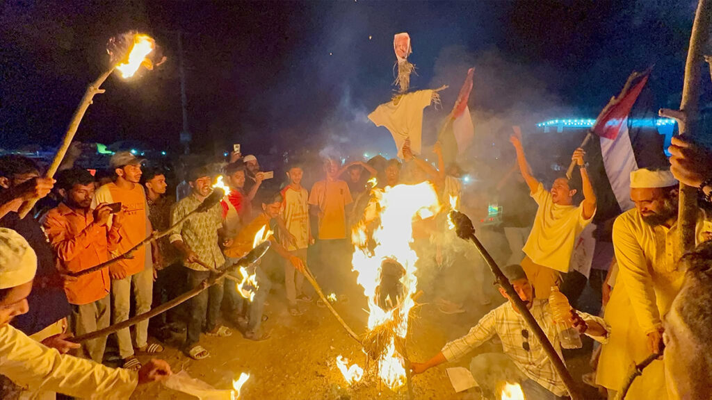 গাজায় ইসরায়েলি আগ্রাসন, নারী ও শিশু হত্যা এবং মানবতা বিরোধী অপরাধের প্রতিবাদে নাটোরের সিংড়ায় ইসরায়েলি প্রধানমন্ত্রী বেনিয়ামিন নেতানিয়াহু ও মার্কিন প্রেসিডেন্ট ডোনাল্ড ট্রাম্পের কুশপুত্তলিকা দাহ করা হয়েছে।