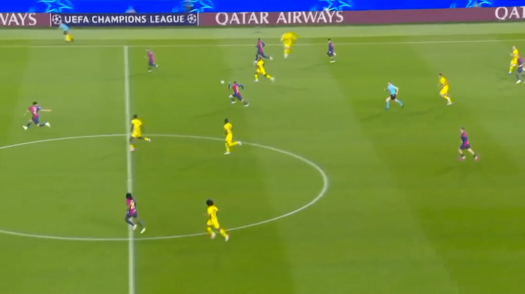 বার্সার একের পর এক আক্রমণে ব্যতিব্যস্ত ছিল ডর্টমুন্ড রক্ষণভাগ। ১-০ গোলে প্রথমার্ধ শেষ হলে বিরতির পর ৪৮ মিনিটেই ব্যবধান দ্বিগুণ করে বার্সা। ইয়ামালের ক্রসে রাফিনিয়ার হেডে গোল করেন লেভানডোভস্কি। ৬৬ মিনিটে নিজের জোড়া গোল পূর্ণ করার পথে দলকে ৩-০ তে এগিয়ে নেন এই পোলিশ স্ট্রাইকার।