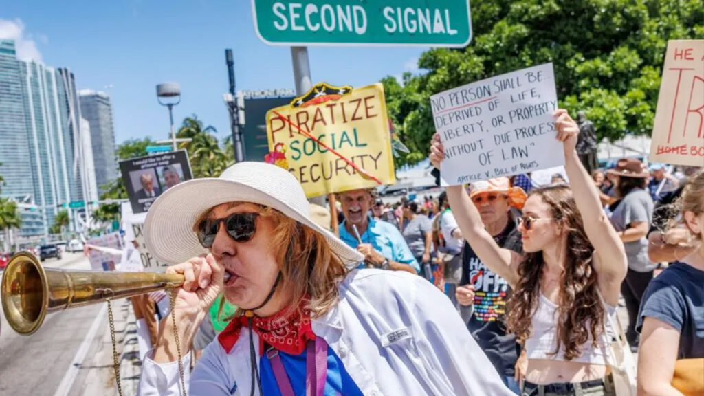 বিক্ষোভ কর্মসূচির অংশ হিসেবে নিউইয়র্ক পাবলিক লাইব্রেরির সামনে জড়ো হন শত শত বিক্ষোভকারী। এরপর এগিয়ে চলেন ম্যানহ্যাটনের রাস্তা ধরে। যুক্তরাষ্ট্রের পতাকা ও পোস্টার হাতে বাদ্যযন্ত্রের তালে তালে চলে স্লোগান। ‘নো কিংস ইন আমেরিকা’ আওয়াজ তুলে জানিয়ে দেন, কোনো স্বৈরাচারকে মেনে নেবে না মার্কিনিরা।