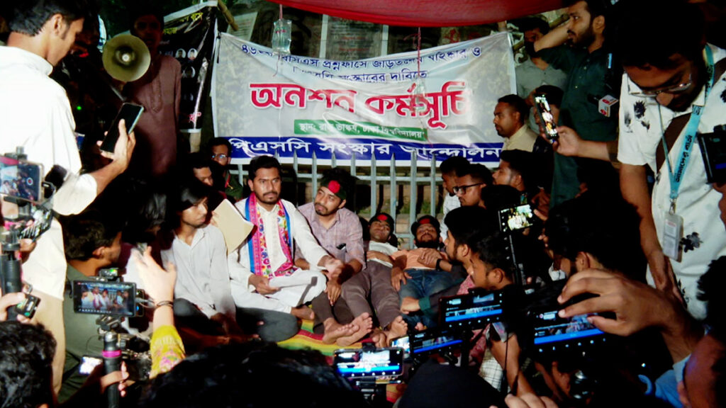 ৪৬ তম বিসিএসে প্রশ্নফাঁসের সাথে জড়িতদের বহিষ্কার, পিএসসির সংস্কারসহ ৮ দফা দাবিতে চলমান আন্দোলনে বিক্ষোভ করেছেন আন্দোলনকারিরা। শনিবার (২৬ এপ্রিল) দাবি আদায়ে রাজু ভাস্কর্যের পাদদেশে অনশন কর্মসূচি পালন করছে ৫ বিসিএসের চাকরি প্রার্থীরা।