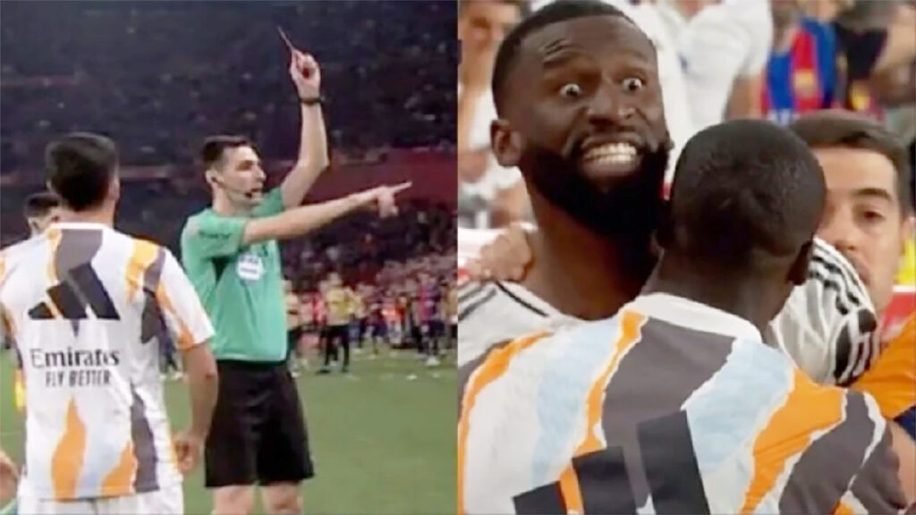 মূলত ম্যাচের শেষ পর্যায়ে এমবাপ্পের এমবাপ্পে ফাউল করেছেন বলে সিদ্ধান্ত দেন রেফারি। এই সিদ্ধান্তেই ক্ষোভে রেফারির দিকে তেড়ে যাচ্ছিলেন রুডিগার। শুধু তাই নয়, অভিযোগ এসেছে রেফারির দিকে লক্ষ্য করে কিছু একটা ছুড়ে মেরেছেন এই রিয়াল তারকা। তবে স্প্যানিশ গণমাধ্যমের খবর, ডাগআউটের বক্সে থাকা বরফ ছুড়ে মারা হয়েছিলো রেফারিকে। ফলে লাল কার্ড দেখেন রুডিগার। এছাড়া, লুকাস ভাসকেজ ও জুড বেলিংহ্যামও লাল কার্ড দেখেন।