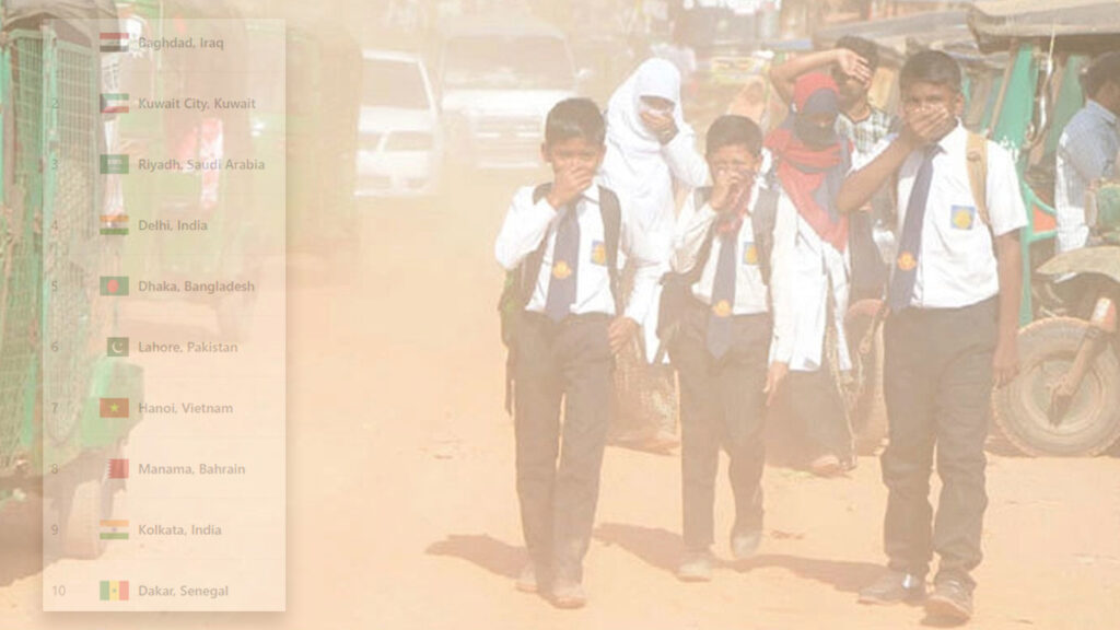 সংস্থাটি জানায়, ৪০৬ স্কোর নিয়ে বায়ু দূষণের তালিকার শীর্ষে অবস্থান করছে ভারতের দিল্লি। দ্বিতীয় স্থানে রয়েছে কুয়েত সিটি। তাদের স্কোর ৩১০। এই দুই শহরের বাতাসের মান সেখানে বসবাসকারীদের জন্য ‘দুর্যোগপূর্ণ’।