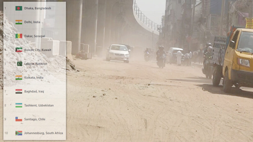 সংস্থাটি জানায়, ১৭৩ স্কোর নিয়ে বায়ু দূষণের তালিকার শীর্ষে অবস্থান করছে বাংলাদেশের রাজধানী। দ্বিতীয় স্থানে রয়েছে প্রতিবেশী দেশ ভারতের রাজধানী দিল্লি, তাদের স্কোর ১৭২। এই দুই শহরের বাতাসের মান সেখানে বসবাসকারীদের জন্য ‘অস্বাস্থ্যকর’।
