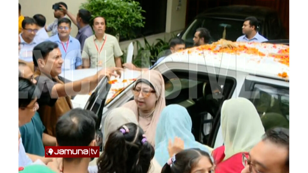 বিমানবন্দর থেকে ফিরোজার পথজুড়ে বিএনপি চেয়ারপারসনকে শুভেচ্ছা জানান দলের নেতাকর্মীরা। তাদের কারও হাতে শোভা পেয়েছে ফুল, কেউ আবার এসেছেন ব্যানার-প্ল্যাকার্ড নিয়ে। কেউ-বা খালেদা জিয়ার ছবিসংবলিত টি-শার্ট পরে আছেন।