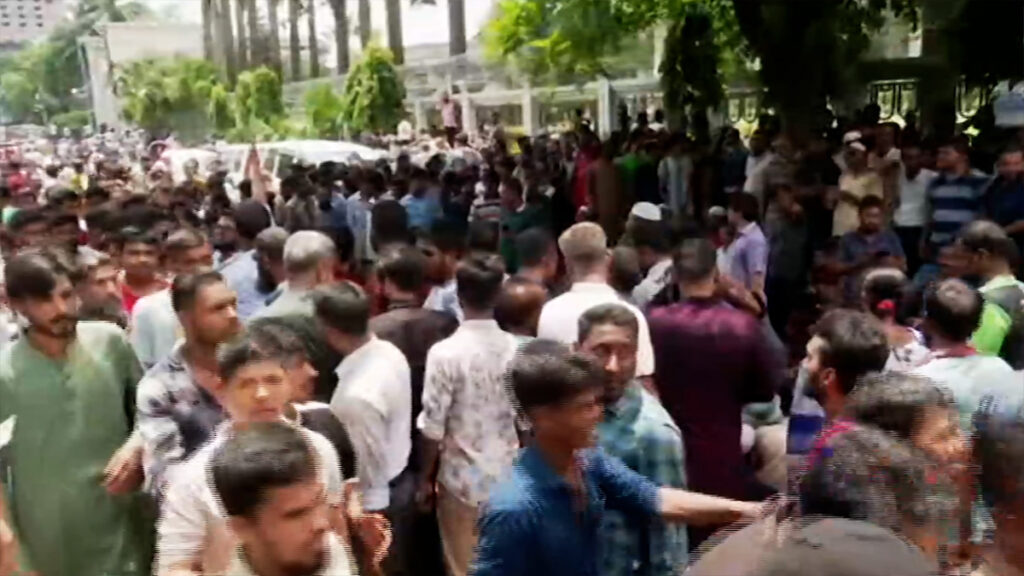 বিক্ষোভকারীদের অভিযোগ, আইন উপদেষ্টা ও স্থানীয় সরকার উপদেষ্টার কারণেই ইশরাক হোসেনকে শপথ পড়ানো হচ্ছে না।