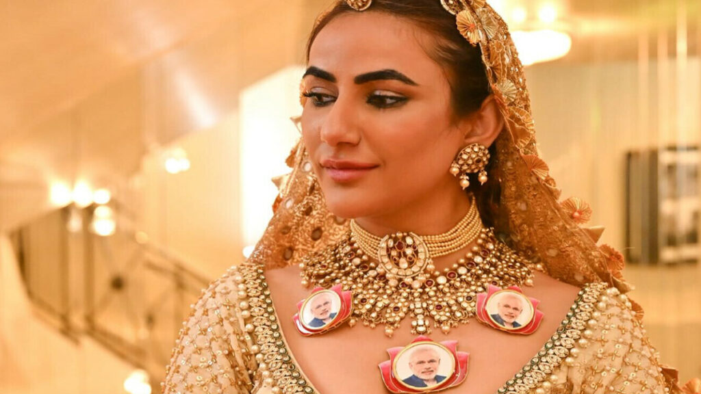 কান উৎসবে তিনি এলেন সোনালী রঙ্গের একটি লেহেঙ্গা পরে। গায়ে ছিলো কুন্দনের গহনা। মাথায় লেহেঙ্গার সঙ্গে মেলানো ওড়না। তবে, এসব কিছুর মধ্যে সবচেয়ে বেশি আলোচিত ছিল গলার লকেটে মোদির ছবি ঝুলানোর দৃশ্য।