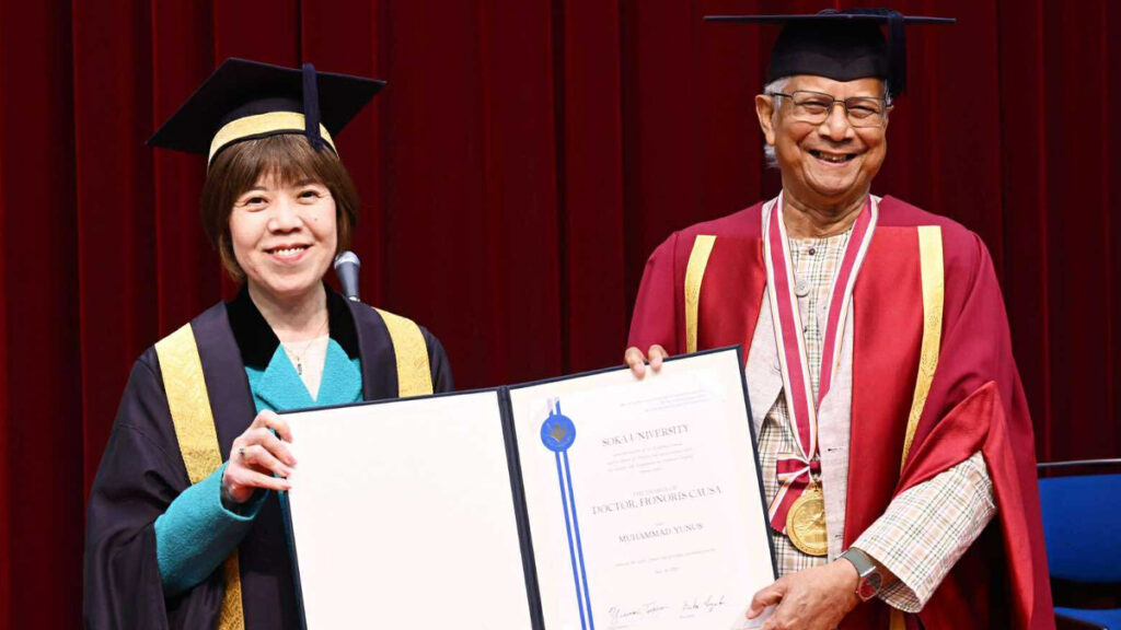 প্রধান উপদেষ্টা অধ্যাপক ড. মুহাম্মদ ইউনূসকে সম্মানসূচক ডক্টরেট ডিগ্রি প্রদান করেছে জাপানের সোকার বিশ্ববিদ্যালয়। শুক্রবার (৩০ মার্চ) এ ডিগ্রি প্রদান করা হয়। বিশ্ববিদ্যালয়ে ভাষণও দিয়েছেন তিনি।