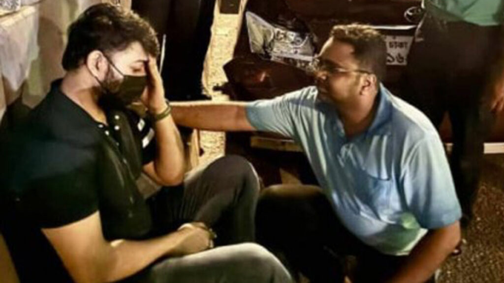 ছবিতে দেখা যাচ্ছে, সড়ক বিভাজনের সঙ্গে হেলান দিয়ে বসে আছেন বাপ্পী চৌধুরী। পাশেই পড়ে আছে ক্ষতিগ্রস্ত গাড়িটি। ঘটনাস্থলে পুলিশ উপস্থিত হয়ে ট্রাকটিকে আটক করেছে। এ বিষয়ে থানায় একটি মামলা দায়ের হয়েছে।