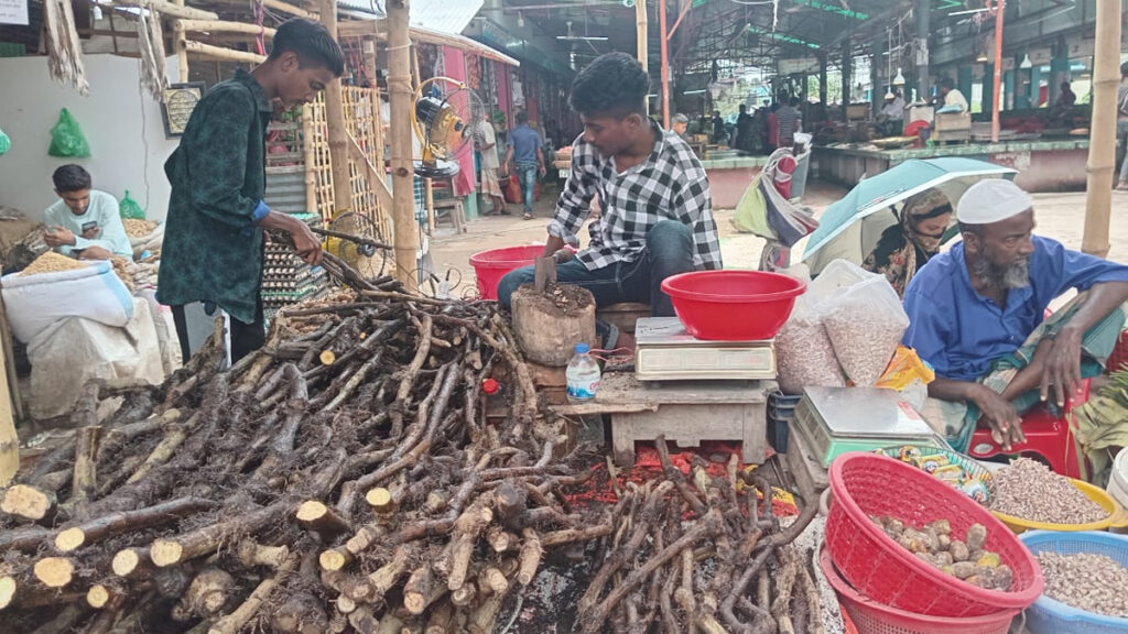 একই বাজারের আরেক বিক্রেতা শুকুর আলী বিশ্বাস প্রায় ৩০ বছর ধরে খুচরা চুইঝাল বিক্রির ব্যবসা করছেন। তার দোকানের সামনে চিকন, মোটা, শিকড় সব ধরনের চুইঝাল রয়েছে।