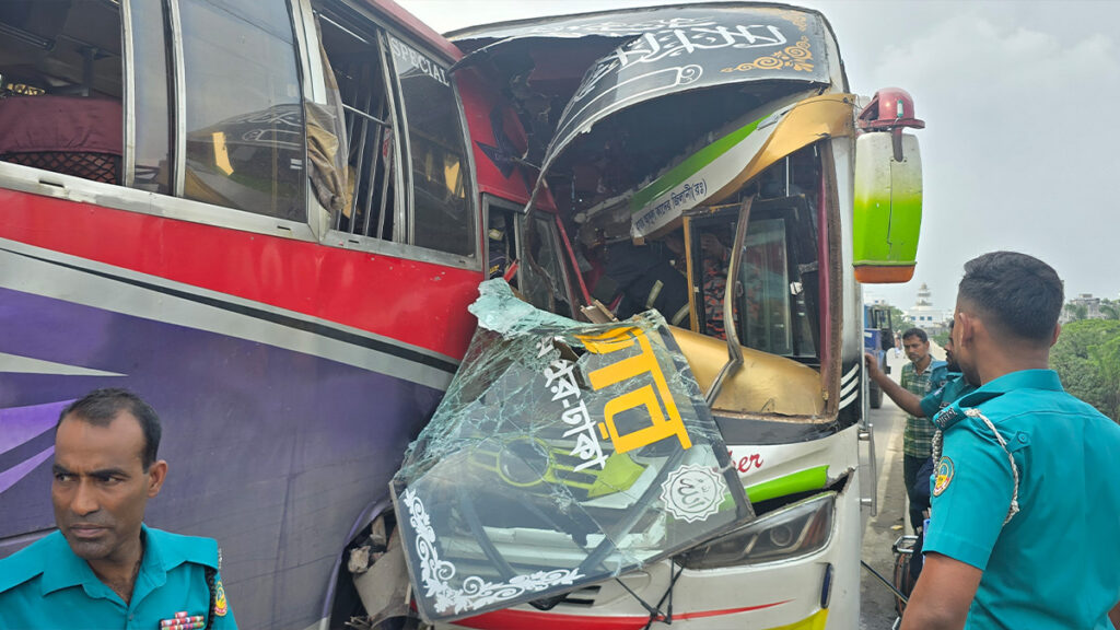 ফায়ার সার্ভিস ও ট্রাফিক পুলিশ সূত্রে জানা যায়, দুপুরে ঢাকা থেকে ছেড়ে আসা সুনিয়া পরিবহনের একটি বাসের সঙ্গে বিপরীত থেকে আসা নবাব সরকার পরিবহনের একটি বাসের মুখোমুখি সংঘর্ষ হয়। এতে অন্তত ৩৫ জন আহত হন।