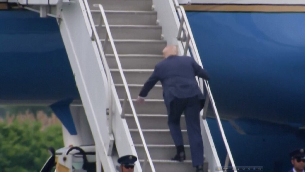 বিমানে উঠতে গিয়ে হোঁচট খেলেন মার্কিন প্রেসিডেন্ট ডোনাল্ড ট্রাম্প। রোববার (৮ জুন) যুক্তরাষ্ট্রের নিউ জার্সি থেকে ক্যাম্প ডেভিডে যাওয়ার জন্য উড়োযানের সিঁড়িতে উঠতে গিয়ে হয় এ বিপত্তি।