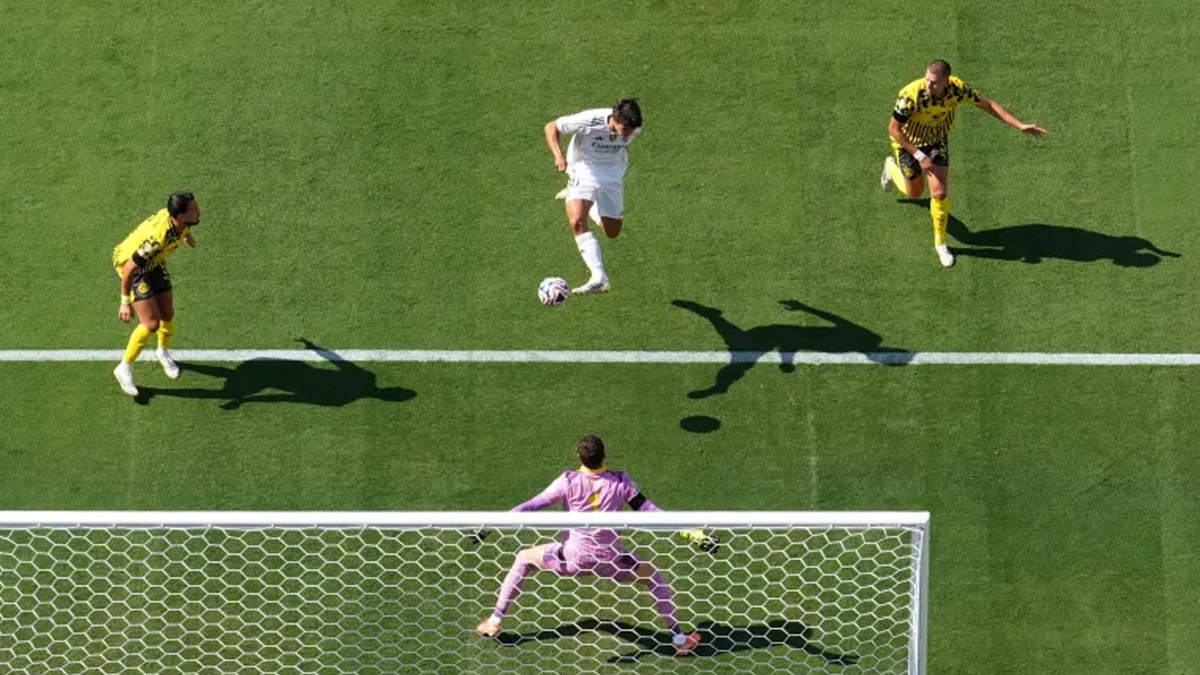 ইনজুরি টাইমের দ্বিতীয় মিনিটে রুডিগারের ভুলে এক গোল শোধ করেন ডর্টমুন্ডের ম্যাক্সিমিলিয়ান। এর দুই মিনিট পরই ৩-১ গোলে এগিয়ে যায় গ্যালাক্টিকোরা। স্কোর শিটে নাম লেখান বদলি নামা কিলিয়ান এমবাপ্পে।