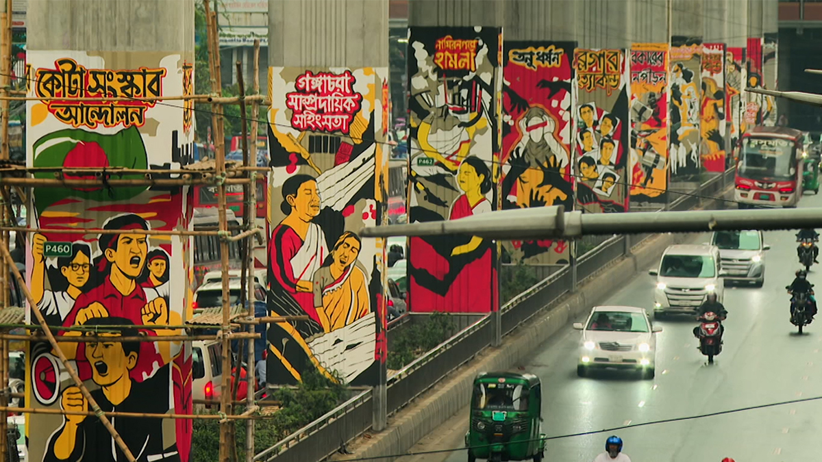 প্রত্যেক পিলারের এক পাশে সাল ও শিরোনাম, বাকি তিন পাশে সে বছরের তিনটি আলোচিত ঘটনা চিত্রায়িত হচ্ছে। জুলাই অভ্যুত্থানের বর্ষপূর্তির আগেই গ্রাফিতি আঁকা শেষ করতে বৃষ্টি উপেক্ষা করে কাজ করছেন চারুশিল্পীরা। শেখ হাসিনা সরকারের দমন-পীড়ন ফুটিয়ে তুলছেন সুনিপুণ হাতে, রং-তুলির আঁচড়ে।