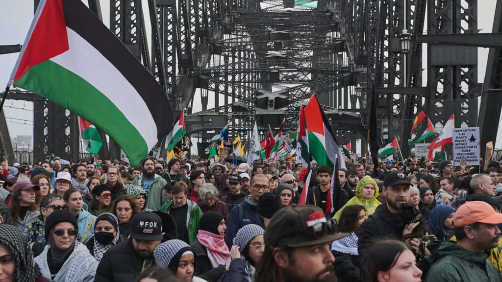 রোববার (৩ আগস্ট) কানায় কানায় পরিপূর্ণ ছিল সিডনির ঐতিহাসিক হারবার ব্রিজ। প্রাকৃতিক বাধা এড়িয়ে মিছিলটিতে অংশ নেয় লাখেরও বেশি মানুষ। উপত্যকায় মানবসৃষ্ট দুর্ভিক্ষের বিরুদ্ধে আওয়াজ তোলেন তারা।