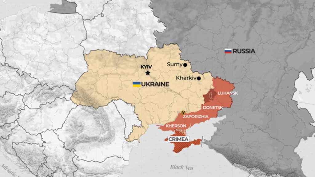 রাশিয়া ইউক্রেনের প্রায় এক-পঞ্চমাংশ—অর্থাৎ ১১৪,৫০০ বর্গকিমি (৪৪,৬০০ বর্গমাইল) দখল করেছে। রাশিয়ার সক্রিয় ফ্রন্টলাইন প্রায় ১,০০০ কিমি (৬২০ মাইল) বিস্তৃত, যার মধ্যে খারকিভ, লুহানস্ক, ডনেৎস্ক, জাপোরিজহিয়া এবং খেরসন অঞ্চল রয়েছে।