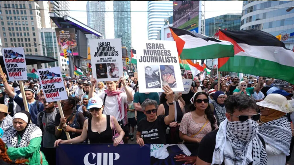 গাজায় গণহত্যার প্রতিবাদে ফুঁসে উঠেছে কানাডার জনগণ। অনাহারে থাকা ফিলিস্তিনিদের জন্য টরন্টোতে রাস্তায় বিক্ষোভ করেছে হাজারো মানুষ। মূলত, গাজায় ইসরায়েলের অবরোধ ও খাদ্য সহায়তা বন্ধ করার নীতির বিরুদ্ধে রাস্তায় নেমে প্রতিবাদ করছে তারা। বিক্ষোভকারীরা দাবি করেন, গাজাবাসীদের ইচ্ছাকৃতভাবে ক্ষুধার মধ্যে রাখা আন্তর্জাতিক আইন ও মানবাধিকারের চরম লঙ্ঘন।