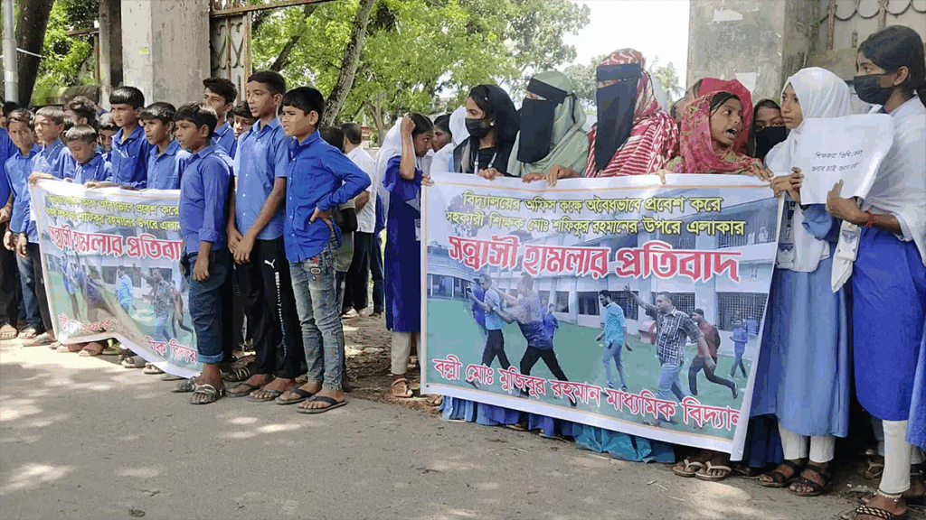 সাতক্ষীরা সদরের বল্লী মোহাম্মদ মুজিবুর রহমান মাধ্যমিক বিদ্যালয়ের শিক্ষক শফিকুর রহমানের ওপর বিএনপি নেতাকর্মীদের হামলার প্রতিবাদে বিক্ষোভ ও মানববন্ধন করেছে শিক্ষার্থীরা।