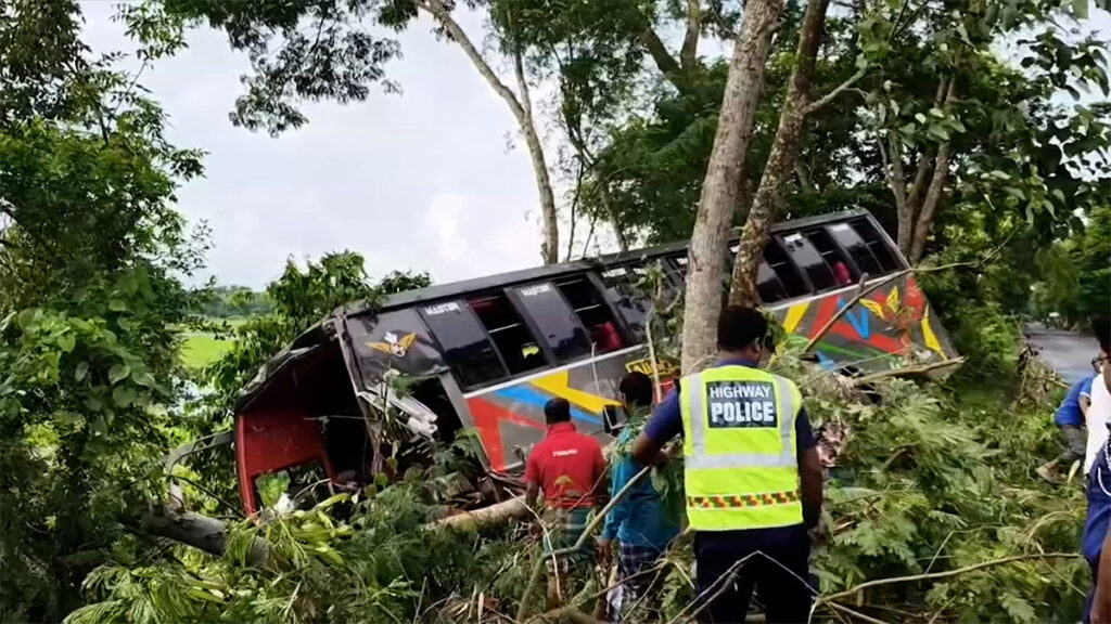 হাইওয়ে পুলিশ জানায়, শনিবার সকালে সাতক্ষীরা থেকে বাসটি ঢাকার দিকে যাচ্ছিলো। পথিমধ্যে পোনা এলাকায় পৌঁছালে বাসটির নিয়ন্ত্রণ হারিয়ে ফেলে চালক। পরে সড়কের পাশে গাছের সাথে ধাক্কা লেগে বাসটি খাদে পড়ে যায়। এতে বাসে থাকা অন্তত ২০ জন যাত্রী আহত হন।
