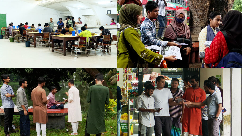 সরেজমিন গিয়ে দেখা যায় ঢাবির বিভিন্ন হলে সামনের নির্বাচন নিয়ে প্রচারণা চলছে ভালো গতিতেই। যারা হল সংসদে ভিপি, জিএস এজিএসসহ নানা পদে প্রার্থী হয়েছেন, তাদের সবার প্রথম ভাবনাতেও যেন মুখ্য ইশতেহার খাবারের মান উন্নয়নে কাজ করা।