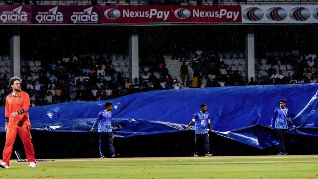 সিলেটে বাংলাদেশ-নেদারল্যান্ডসের তৃতীয় ম্যাচে আবারও বৃষ্টি হানা দিয়েছে। প্রথম ইনিংসের ১৮ ওভার দুই বল শেষে বৃষ্টির বাগড়ায় খেলা বন্ধ হয়ে যায়।
