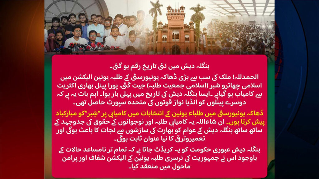 بنگلہ دیش کی تاریخ میں پہلی مرتبہ ڈھاکہ یونیورسٹی کے طلبہ یونین الیکشن میں اسلامی چھاترو شبر (اسلامی جمعیت طلبہ) کو پورے پینل کے ساتھ بھاری کامیابی پرمبارکباد۔
