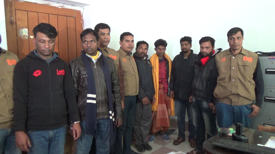 গ্রেফতারকৃতরা হলো, রাজশাহীর বাঘা উপজেলার খায়েরহাট গ্রামের মোলাম দালালের ছেলে ইন্তু দালাল, কলিগ্রাম গ্রামের রনজিত আলী প্রামানিকের ছেলে বাবু প্রামানিক ও খাগরবাড়ি গ্রামের শহিদুল কারিগরের ছেলে সোহেল রানা, চারঘাট থানার বাটিকামারি গ্রামের চাঁন মোহাম্মদের ছেলে আবুল কালাম ও মুংলি গ্রামের মৃত আমিরুল ইসলামের ছেলে রাসেল আহম্মেদ এবং নাটোরের লালপুর উপজেলার মিয়াপুর গ্রামের মাজদার হোসেনের ছেলে আফজাল হোসেন।