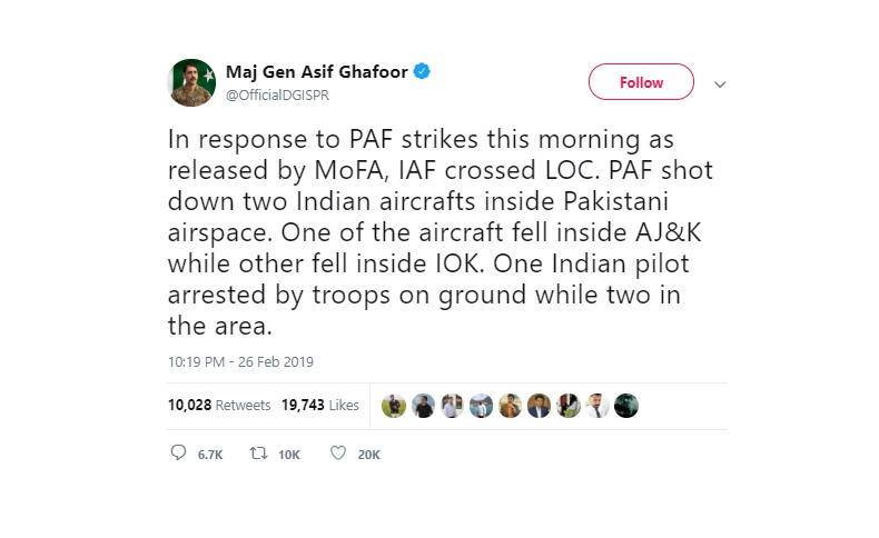 তিনি লিখেছেন, ‘সকালে পাকিস্তান বিমান বাহিনী কর্তৃক ভারতে হামলার জবাবে লাইন অব কন্ট্রোল অতিক্রম করে ভারতীয় বিমান। এ সময় পাকিস্তান বিমান বাহিনী দুটি ভারতীয় বিমানকে ভূপাতিত করেছে। একটি বিমান আজাদ কাশ্মিরে এবং অন্যটি ভারত অধিকৃত কাশ্মিরে পড়েছে। একজন ভারতীয় পাইলটকে গ্রেফতার করা হয়েছে।”