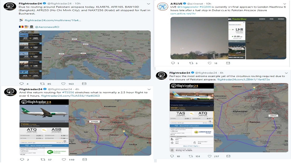 ফ্লাইট ট্র্যাকিং সাইট ফ্লাইট রাডার ২৪ এর দেখানো চিত্র অনুযায়ী পাকিস্তানের আকাশসীমা বন্ধ হওয়ার কারণে বহু আন্তর্জাতিক ফ্লাইট তাদের গন্তব্য পরিবর্তন করেছে অথবা তাদের ফ্লাইট বাতিল করেছে। এতে করে ভোগান্তীতে পড়েছে এইসব রুটে চলাচলকারী সাধারণ যাত্রীরা।