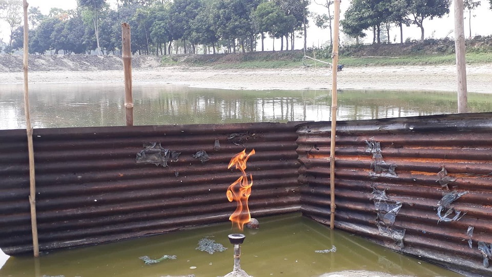 বৃহস্পতিবার দুপুরে গিয়ে দেখা গেছে পুকুরের পানি সংলগ্ন একটি লোহার পাইপে দাউ দাউ করে আগুন জ্বলছে। আর বিষয়টি দেখতে পুকুরের চার পাড়ে উৎসুক জনতা ভিড় জমাচ্ছেন।
